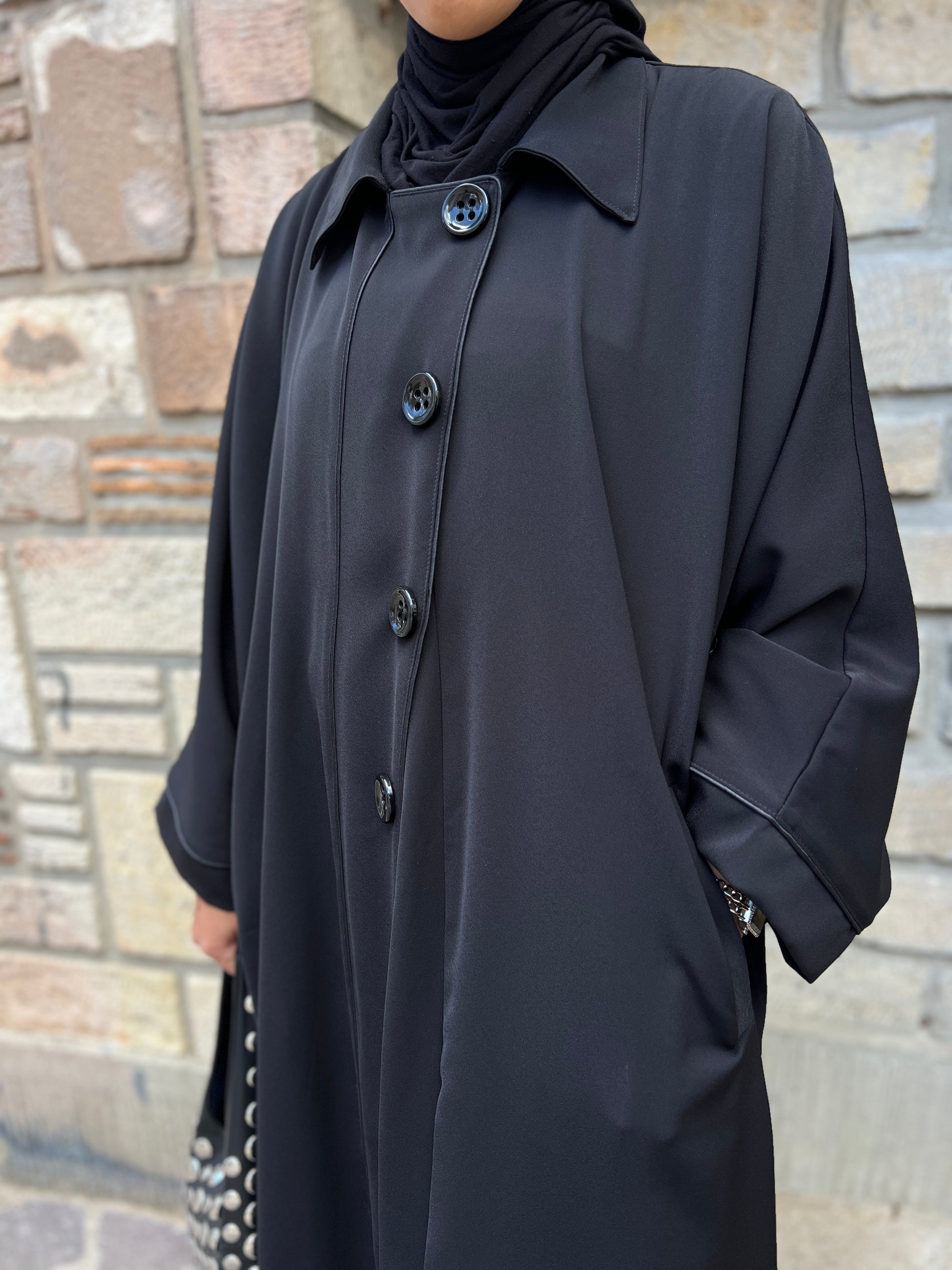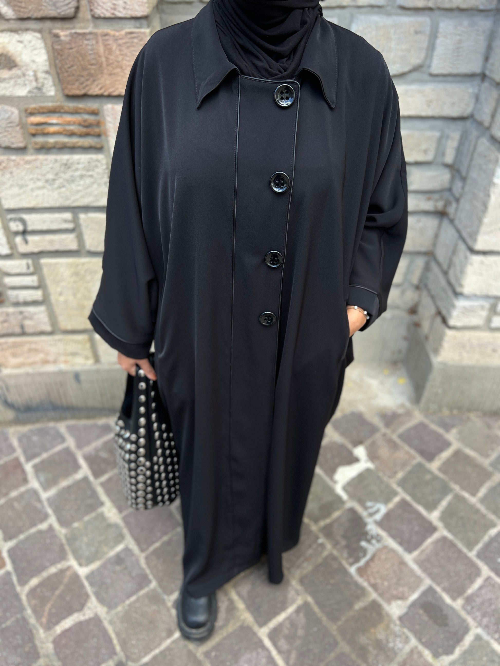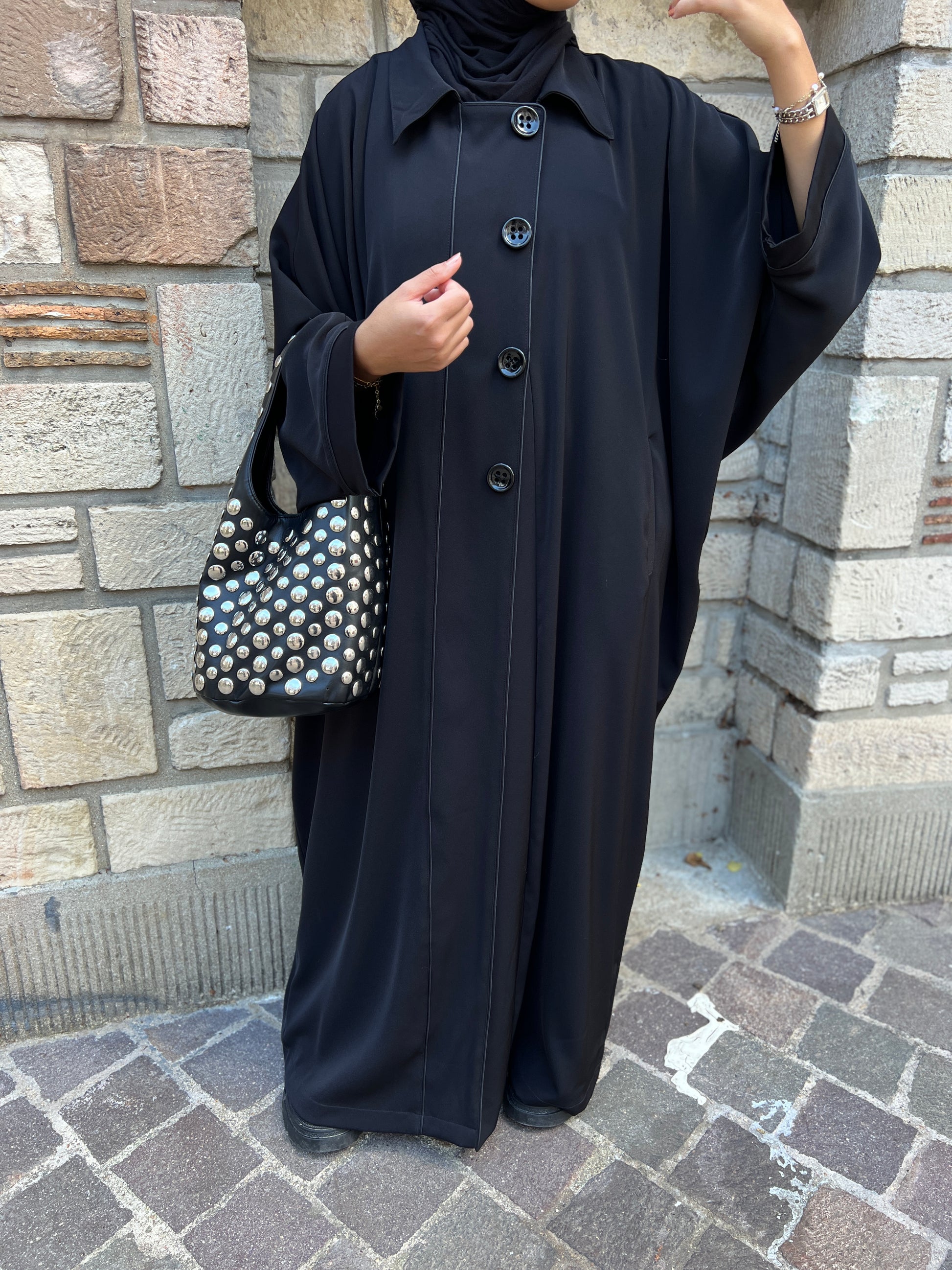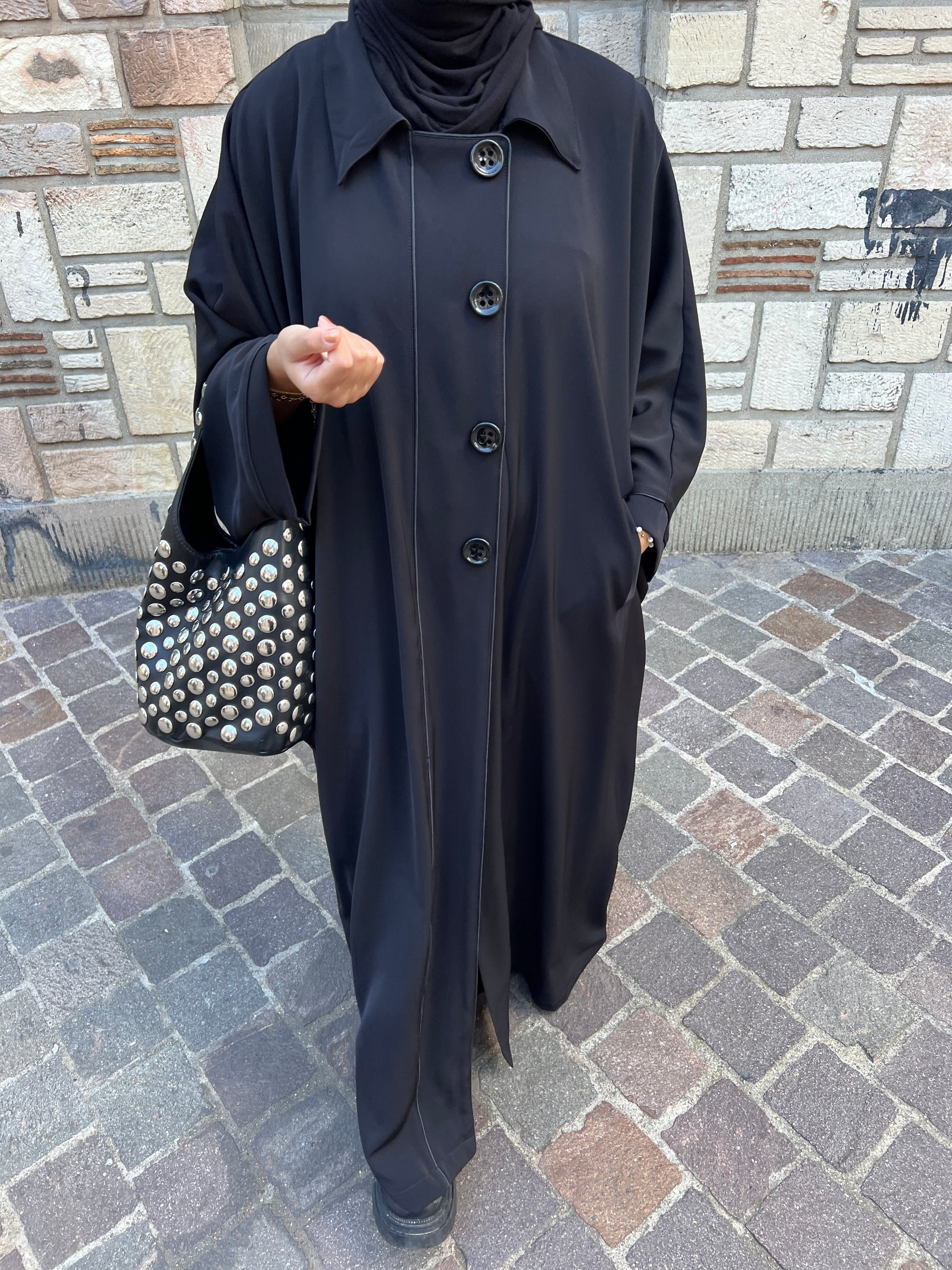Abaya noire fluide à coupe oversize, rehaussée de grands boutons et d’un col chemise pour une allure chic et minimaliste.