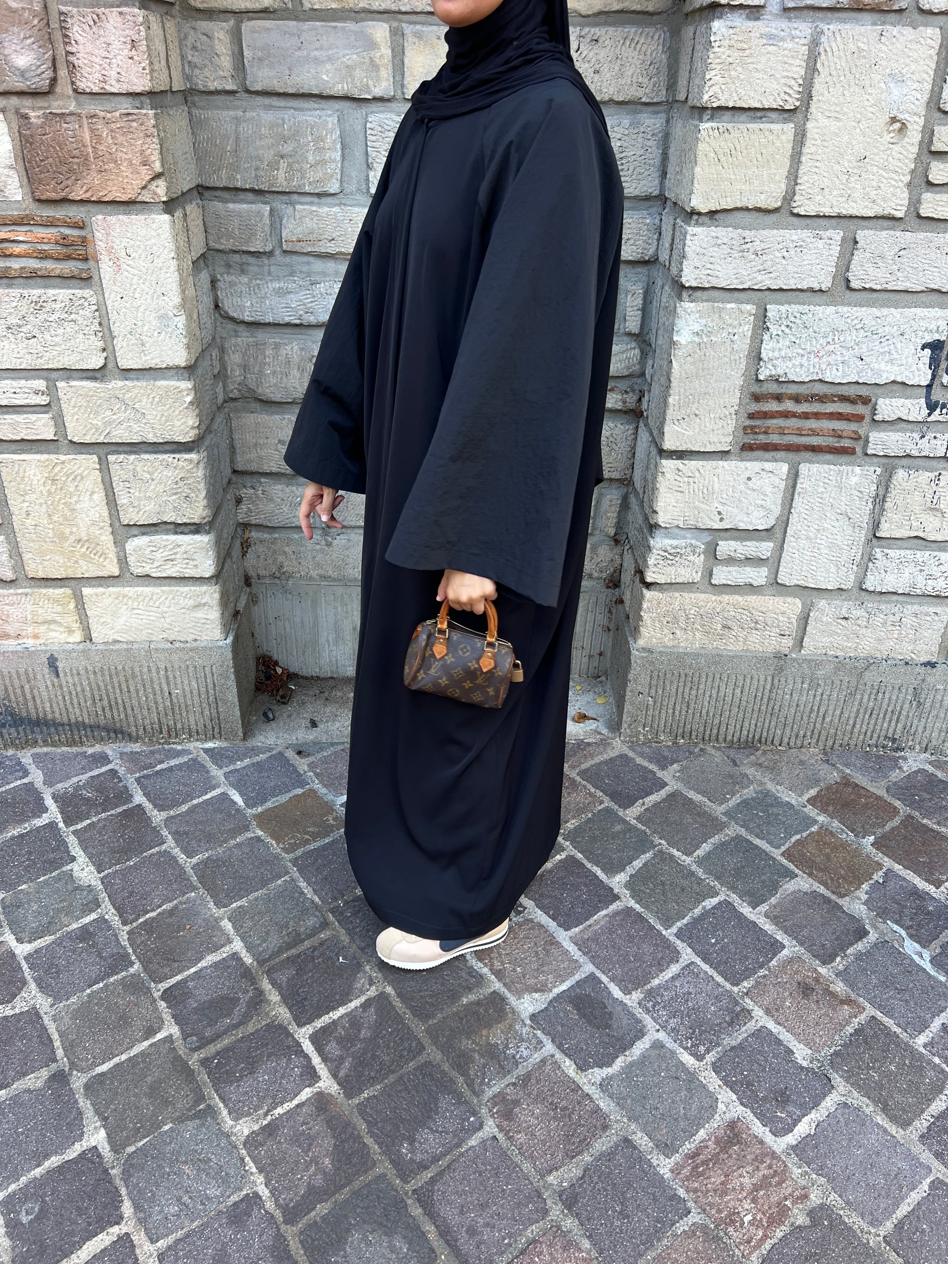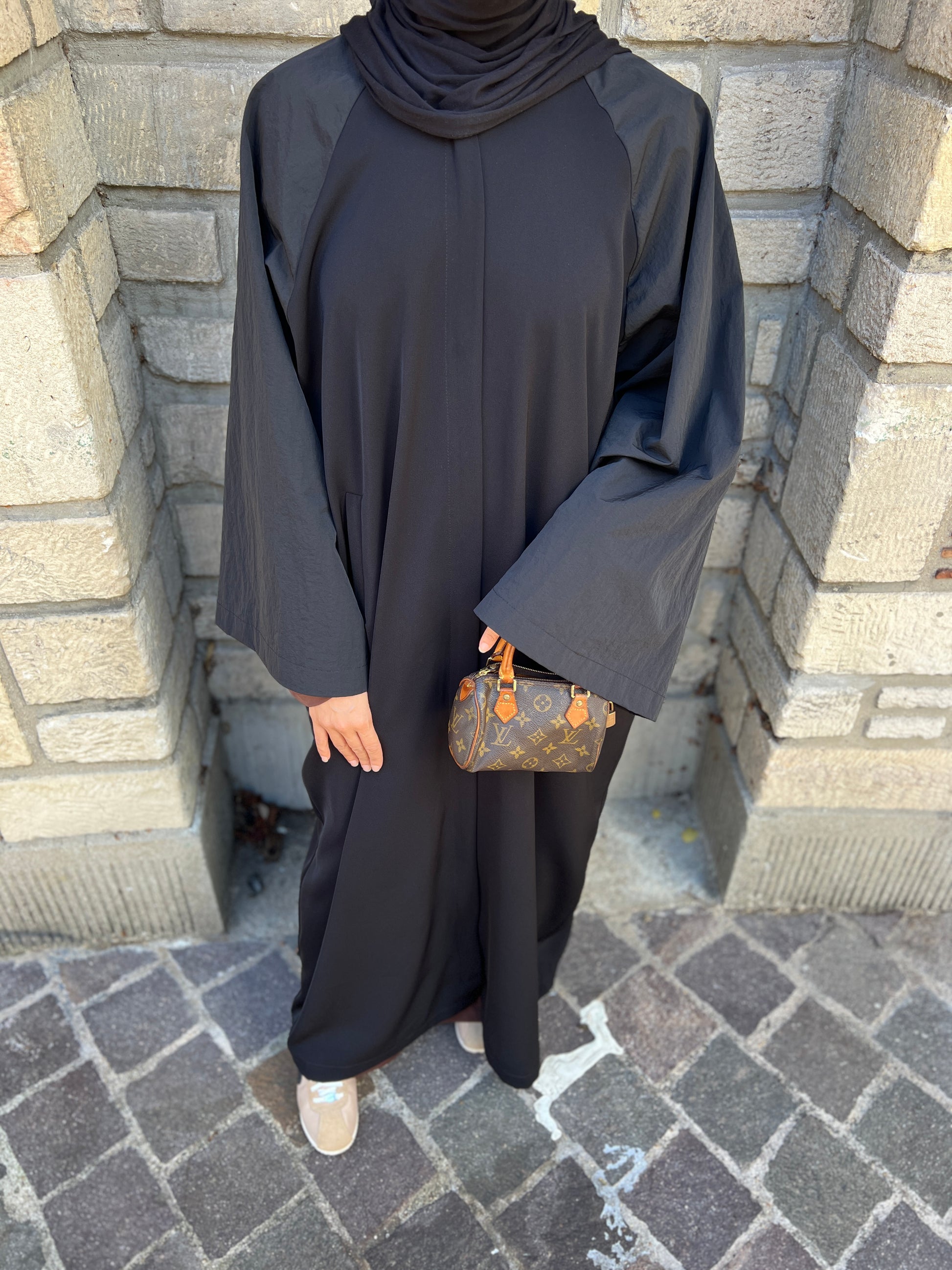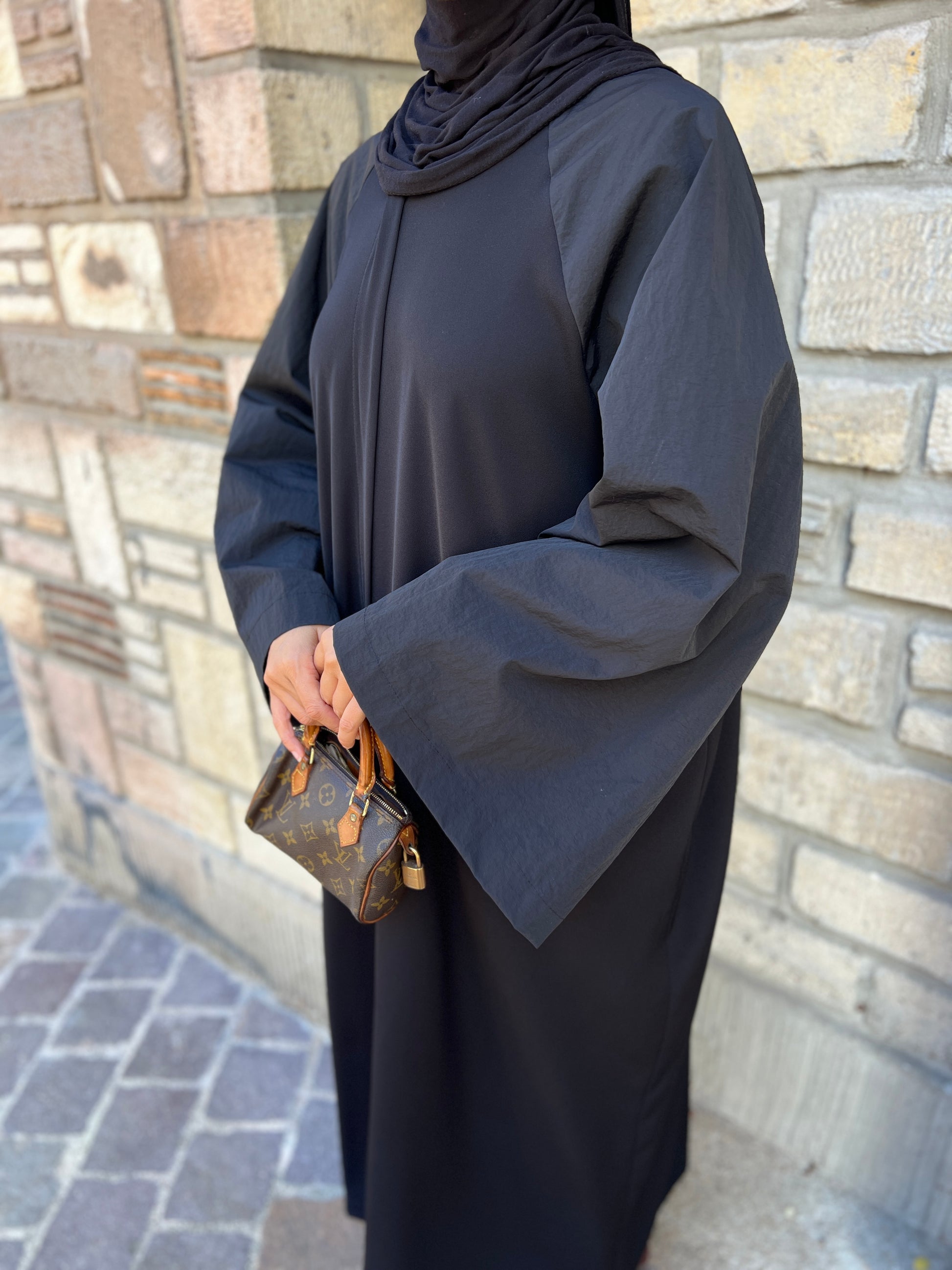 Abaya noire zippée sur le devant, au design moderne mêlant élégance et praticité, avec des manches larges effet k-way qui apportent une touche contemporaine et texturée à la silhouette.